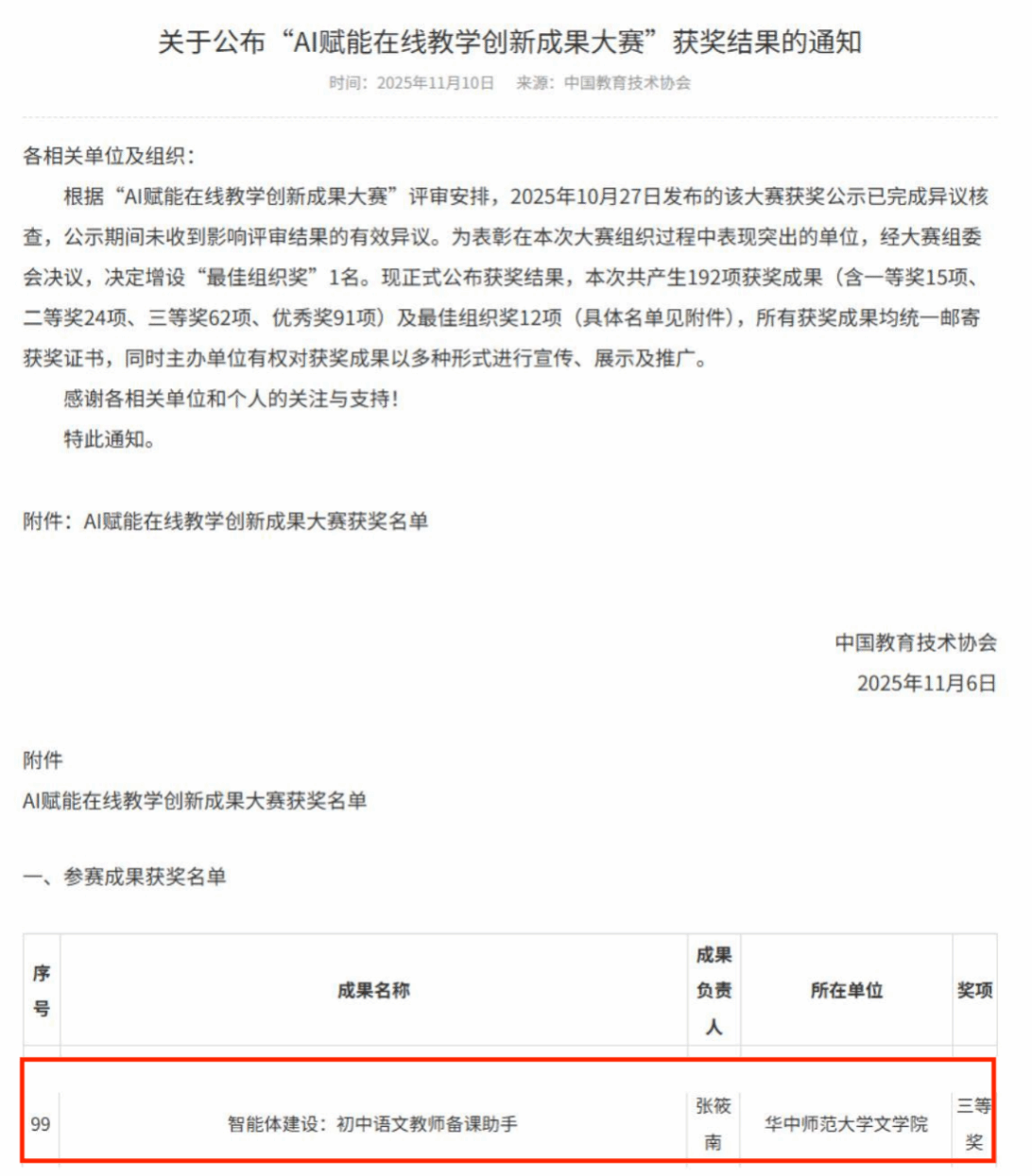 文学院讯(通讯员 梁芳菲 王铭浩)近日,由中国教育技术协会组织举办的首届全国“AI赋能在线教学创新成果大赛”落下帷幕,华中师范大学文学院副教授张筱南负责的《智能体建设:初中语文教师备课助手》项目荣获三等奖。