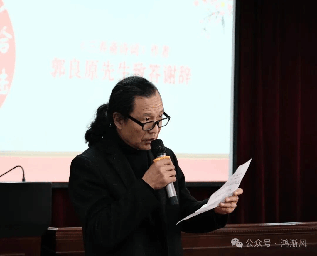 《三弄斋诗词》作者郭良原致答谢辞。他提到,离开母校已43年,再次回到桂子山,感受到无尽的芳香和温暖,感谢母校的悉心栽培,感谢各位嘉宾真诚的支持、中肯的评价、善意的批评和热忱的期望。最后,他衷心祝愿湖北文学、湖北诗词繁荣昌盛,祝愿桂子山花开四季、桃李天下。