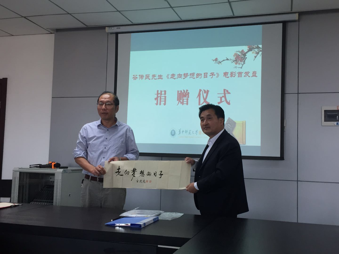 10月10日,由华中师范大学文学院校友、词作家、编剧谷传民先生编剧的《走向梦想的日子》电影首发盘捐赠仪式在该校图书馆九楼风雅斋举行。