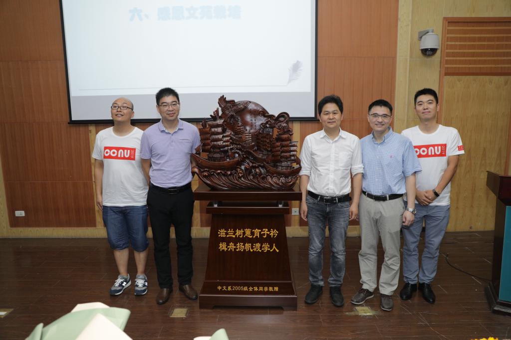 潘秋子、王璠、来瑞、王健男、程亚丽、杨罗群、王侯丽、廖莹莹、金子靖9位同学为参加活动的老师献上鲜花,向一生的恩师致谢。常帅、黄细刚同学代表中文系2005级全体同学向文学院送上一尊扬帆起航的木雕,祝福文学院潮平两岸阔,风正一帆悬,祝愿老师们桃李满天下,春晖遍四方。活动结束后,大家在文学院楼前合影留念。