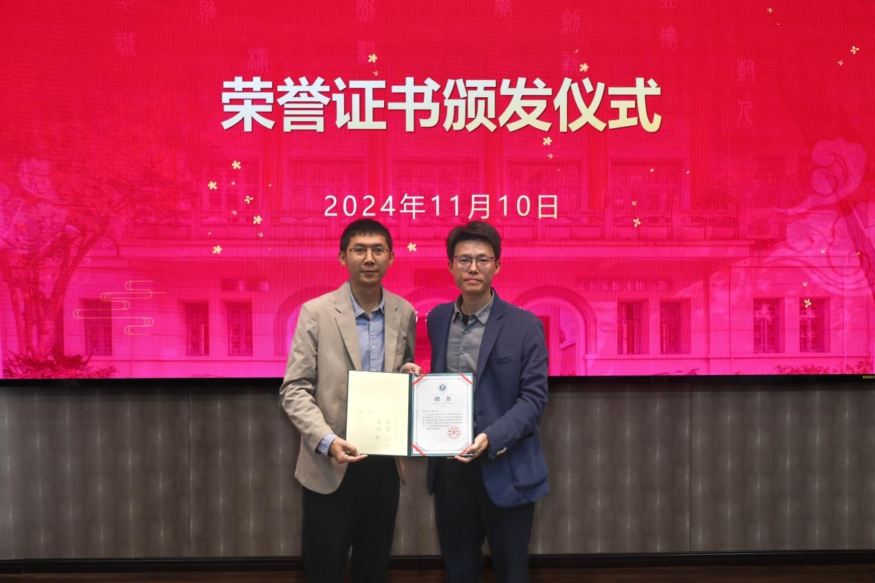 报告结束环节,桂文亮副书记受学校委托,为牛杰校友颁发荣誉聘书并合影留念。