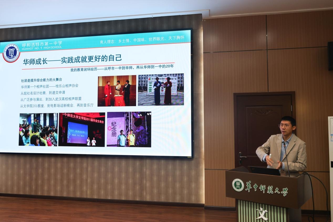 文学院讯(记者 雷滕菲 洪亚琳 李菊慧)11月10至11日,第220期博雅大讲堂暨优秀校友返校分享活动与座谈会分别在文学院一楼报告厅和三楼会议室举行。文学院2007级校友、呼和浩特市第一中学副校长牛杰以“从珞喻路152号到环河街33号——一名公费师范生的成长之路”为题做专题分享报告,文学院2007级首届公费师范生代表牛杰、喻业伟、柳雅参加座谈会,分别就自身发展经历做经验分享。文学院党委副书记桂文亮,本科生辅导员袁瑞磷、叶政通、夏文娟参加活动,各年级师生代表和部分其他学院学生参加报告会,文学院各年级公费师生、优师计划生、少数民族学生代表参加座谈。
