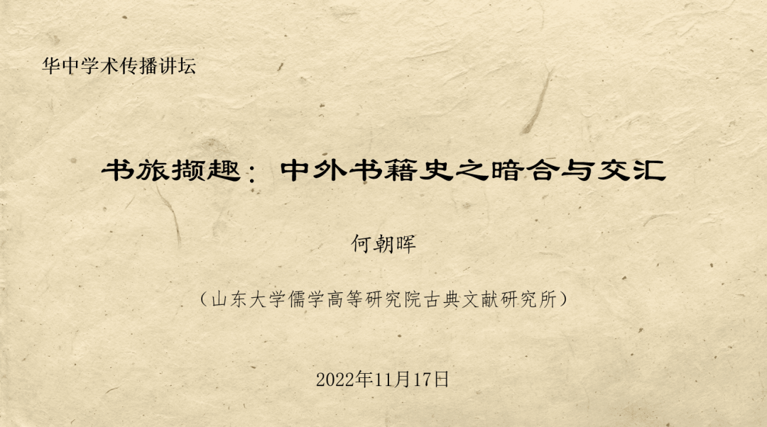 (通讯员:彭昱剑)11月17日晚7点半,“华中学术传播讲坛”如期开讲。本次讲座由华中师范大学文学院主办,华中师范大学文化传播研究中心承办,华中师范大学文学院教授、博士生导师范军主持,邀请到山东大学儒学高等研究院古典文献研究所教授、博士生导师何朝晖云端开讲。他为广大师生带来题为“书旅撷趣:中外书籍史之暗合与交汇”的学术讲座,共有280多人收听收看了此次演讲。