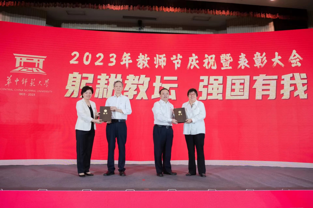 9月13日,在华中师范大学2023年教师节庆祝暨表彰大会上,我校中国近代史研究所教授朱英、文学院教授胡亚敏获聘人文社会科学资深教授,我校党委书记夏立新、校长郝芳华为两位教授颁发了聘书。