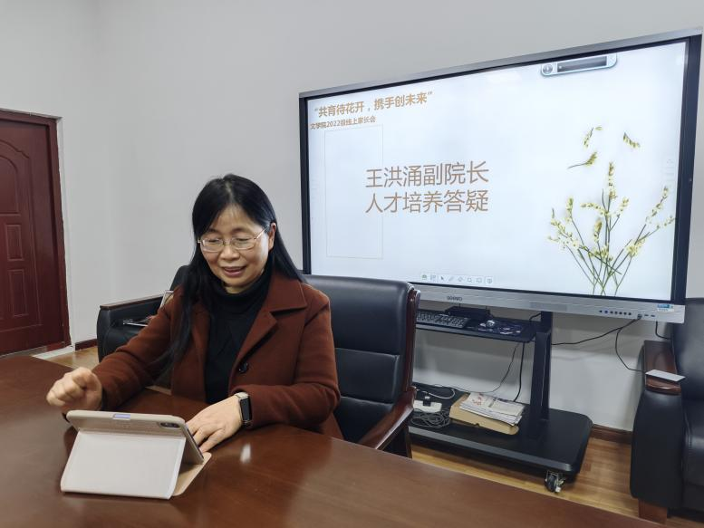 副院长王洪涌围绕人才培养进行答疑,就学校及学院人才培养目标、学生管理、教学管理等工作向家长们进行了答疑介绍。详细回答了中国语言文学类专业分流、公费师范生培养、拔尖计划2.0学生培养等家长们关心的共性问题。希望家长成为学生成长成才道路上的引导者和陪伴者,在家校共同助力中帮助学生及时进行生涯规划和探索,赋能个人发展。
