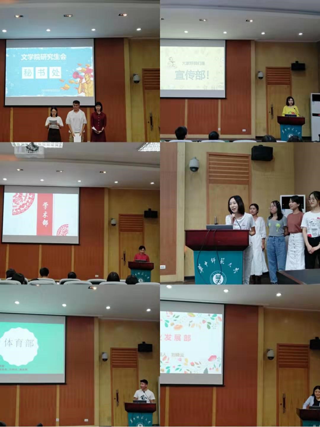 随后,研究生辅导员刘晓庆老师宣读2019届文学院研究生会成员名单。2019届研究生会秘书处、宣传部、学术部、文艺女生部、生活权益部、体育部和职业发展部成员依次上台展示部门风采和部门规划,展现了新一届研究生会成员积极活泼的风貌,表达了大家对共建研会的热情和信心。