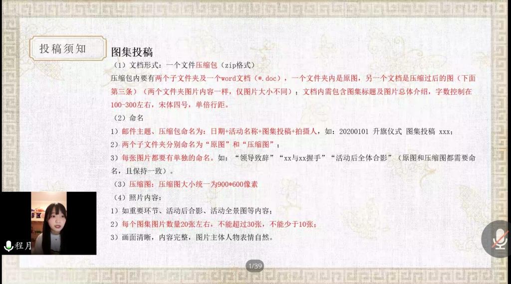 随后,学创中心负责人许畅从文院社会实践申报情况、校团委通知注意事项和社会实践成果提交三个方面讲解了暑期实践的注意事项。其中,她着重强调了校团委通知的注意事项,提醒同学们线上创建时所有社会实践团队需要在全国“三下乡”官网报备,做好前期准备工作。她也提到在活动期间为了同学们的实践安全和项目的顺利进行,学校要求各团队负责人为线下活动成员购买短期意外险并严格执行每日安全汇报制。同时,实践活动的项目经费可以进行一定程度的报销。此外,她还向同学们推荐了实践团队在进行新闻宣传时可供参考的投稿媒体,丰富最终提交的社会实践成果。接着是宣传中心新闻部副负责人程月对参与暑期社会实践的同学进行宣传培训,除了讲解宣传内容和写稿须知等宣传工作的基本知识外,她还介绍了华大青年网和公众号投稿时的注意事项。