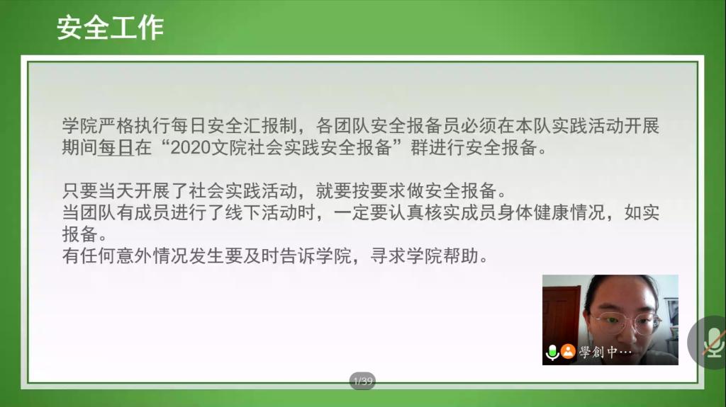 (通讯员 刘忠帆)7月24日下午,由共青团华中师范大学文学院委员会主办,文学院团委学生会学术创新与劳育中心承办的文学院2020年暑期社会实践动员大会在腾讯会议平台进行线上直播。文学院党委副书记徐福刚出席此次大会,19级学创中心主负责人许畅、文学院宣传中心新闻部副负责人程月和文学院16级毕业生莫琳琳担任主讲人,文学院团委书记李哲立担任主持人。