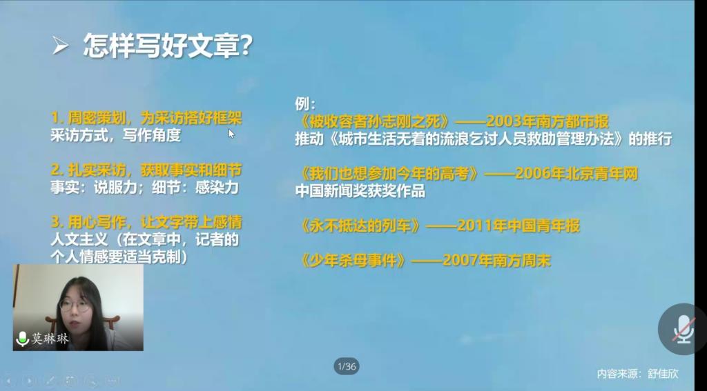 接下来是16级毕业生莫琳琳进行优秀实践的个人经验分享。大学期间莫琳琳在校内外媒体都有过一定的工作经历,并于2019年暑期社会实践活动中任七色花支教队的宣传组组长,宣传工作方面经验十分丰富。本次大会中,她主要从团队宣传、实践成果和成果推广三个方面分享了自己的经验。首先,莫琳琳建议同学们在借助校内外资源进行团队宣传的同时要注重自身平台建设,她还针对暑期实践活动列出了全方位的投稿渠道,并结合当前实际状况对投稿平台进行了排序和筛选。此外,莫琳琳提到了投稿内容多元化、增强内容可读性也是宣传稿件的加分项,“优秀的宣传稿件除了格式要规范,扎实的采访和周密的策划也是必不可少的”。实践成果部分,莫琳琳主要介绍了调研及报告撰写的注意事项,也建议同学们在成果推广期间积极关注后期的参赛消息,提前做好准备。
