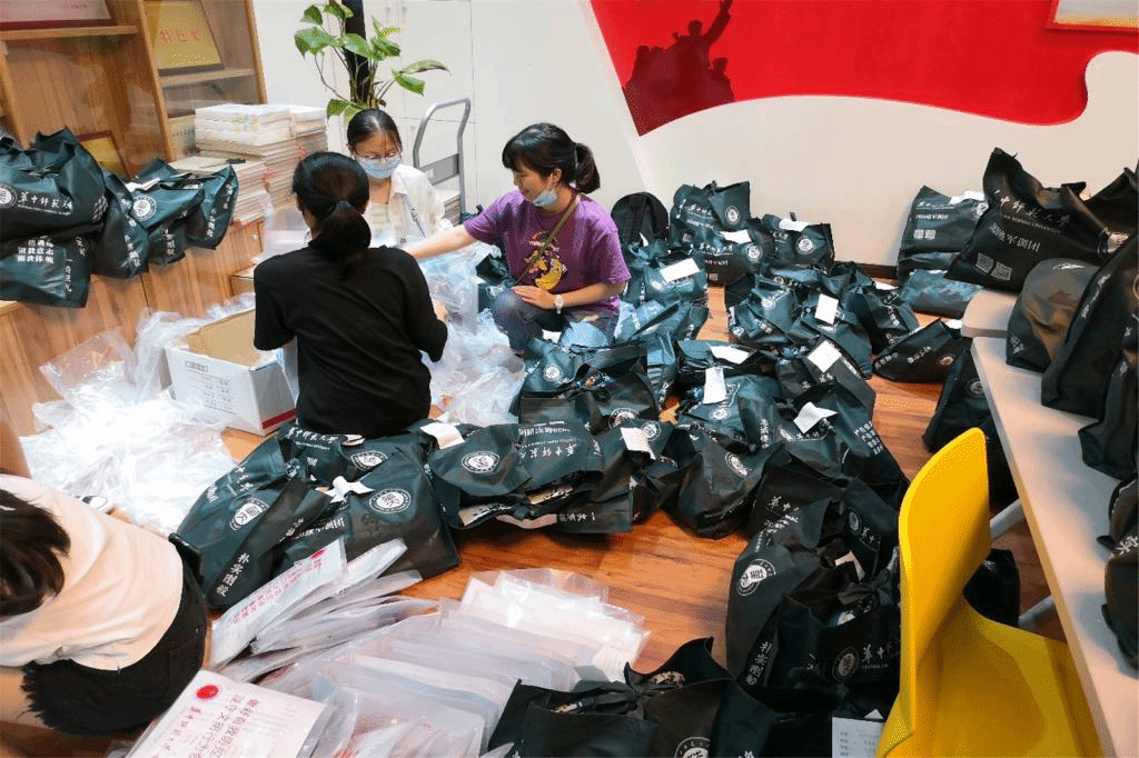 志愿者还分批次参与了新生物资的分类与整理。一批志愿者将学校提前购买的军训服装和鞋袜等按照人数分类,收纳入迎新袋;另一批志愿者则领取配对新生的一卡通、胸牌、防疫物资等,并帮助新生将相关物资放回宿舍,方便了后期迎新工作的开展。在整理过程中,由于物资繁杂,报到新生人数众多,志愿者的工作量很大,但大家齐心协力、认真负责,仔细地核对物品清单,并在名单上签名确认物品齐全,最终让新生们收到了完好无损的开学用品。
