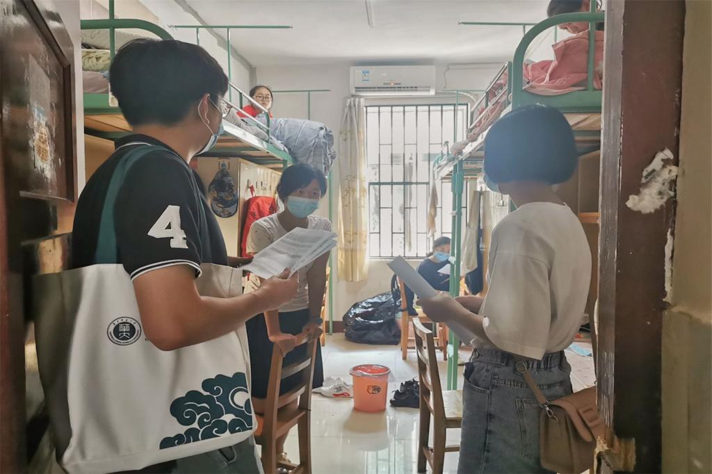 朱庆海书记同两位辅导员一同抵达学生宿舍,向新生们送上了来自文学院的新学期问候与祝福,并在清点寝室人数的同时给每位新生发放“文院新生明白纸”,详细地向同学们解释纸上包含的未来两天日程安排和注意事项,提醒新生做好疫情防控和诈骗防备。随后,领导老师们还一同查看了新生宿舍的基础设施,并嘱咐他们务必注意内务卫生、财务安全、用电安全和人身安全等。