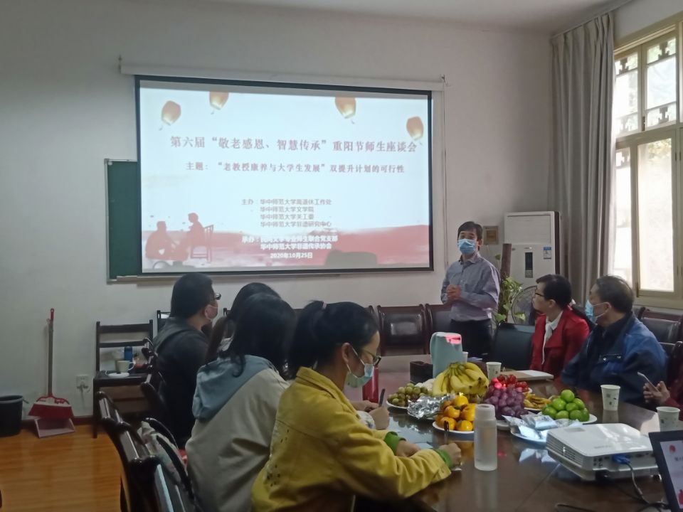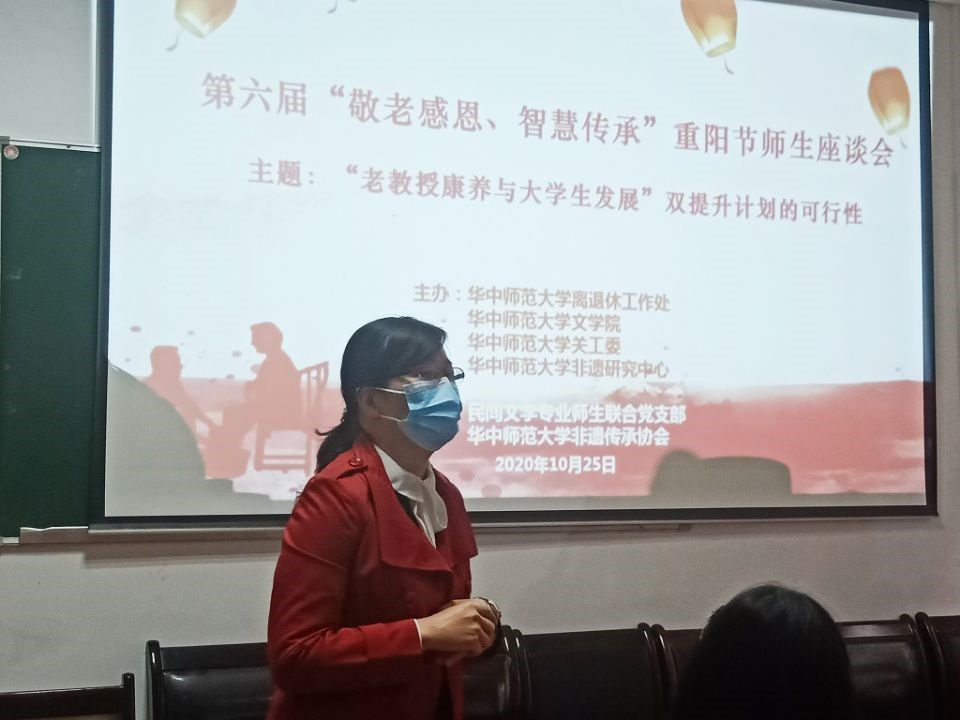(通讯员 张思怡)2020年10月25日下午3时,第六届“敬老感恩,智慧传承”重阳节师生座谈会在文学院203教研室召开。座谈会特别邀请文学院著名学者刘守华教授、心理学院陈丽梅副教授、校关工委常务副主任谭根稳、关工委副主任朱斌、文学院分党委副书记徐福刚、离退休工作处副处长潘珞琳以及文学院孙正国教授参与座谈。民间文学党支部同学和非遗协会学生代表,聆听老师精彩发言并与老师面对面交流。