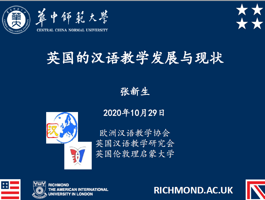 (通讯员:吴容梅、李欣)2020年10月29日下午,由华中师范大学文学院“汉语国际教育与传播研究”青年学术创新团队精心筹办的“后疫情时代的国际中文教育与传播”系列在线论坛第四场顺利举办。英国伦敦理启蒙大学教授、现代语言中心主任、欧洲汉语教学协会副会长张新生教授应邀担任主讲嘉宾,做了“英国的汉语教学发展与现状”的学术报告,文学院副教授李炜老师主持了此次讲座。