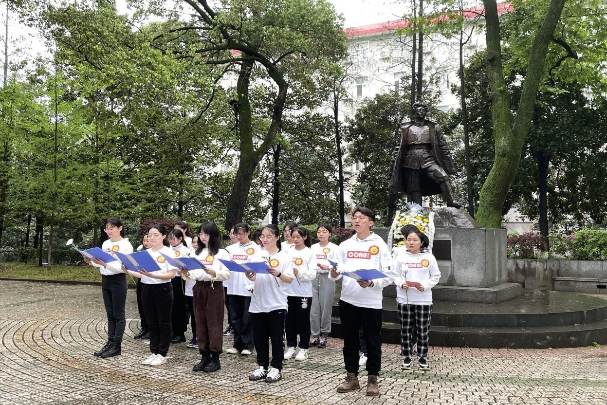 文学院党委副书记徐福刚致辞强调,时值中国共产党成立100周年和国家十四五规划开局之年,学习党史是把握时代大势的需要,是坚守初心使命的需要。通过清明祭奠《黄大合唱》词作者、著名文学家、校友光未然先生,创新党史学习教育形式,有助于深入理解我们党在救亡图存、担当民族复兴重任的历史潮流中发挥的不可替代作用。他呼吁在场的大学生青年党员、入党积极分子和同学们,一定要牢记革命志士的豪迈誓言,一定要传承中国共产党的红色基因,努力学习,刻苦拼搏,弘扬革命精神,做时代新人,为中华民族的伟大复兴不断贡献自己的力量!