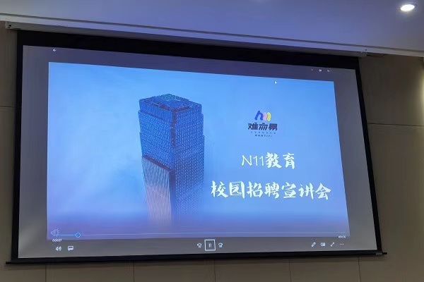 (通讯员 陈雨昕)4月1日下午,N11教育校园招聘宣讲会在文学院一楼报告厅举行。N11(难亦易)教育培训机构的创始人邵鑫亲自到场宣讲,并对投递简历的同学进行了现场面试。本次招聘岗位是5-9年级的语文老师,吸引了来自文院、新传等院系的毕业年级同学参与。