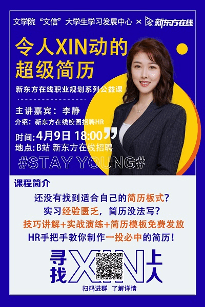 (通讯员 宋喆)4月9-10日晚6点,文学院“文信”大学生学习发展中心与新东方在线共同举行系列就业公开课,旨在推动毕业生就业指导工作,帮助学院学子提升就业素质,本次活动隶属于文学院“文信”学习发展中心2021年度就业指导帮扶系列活动。公开课主题分别为“简历制作”与“求职知识”,主讲人为新东方在线校园招聘HR李静,2017级非师全体同学参加。