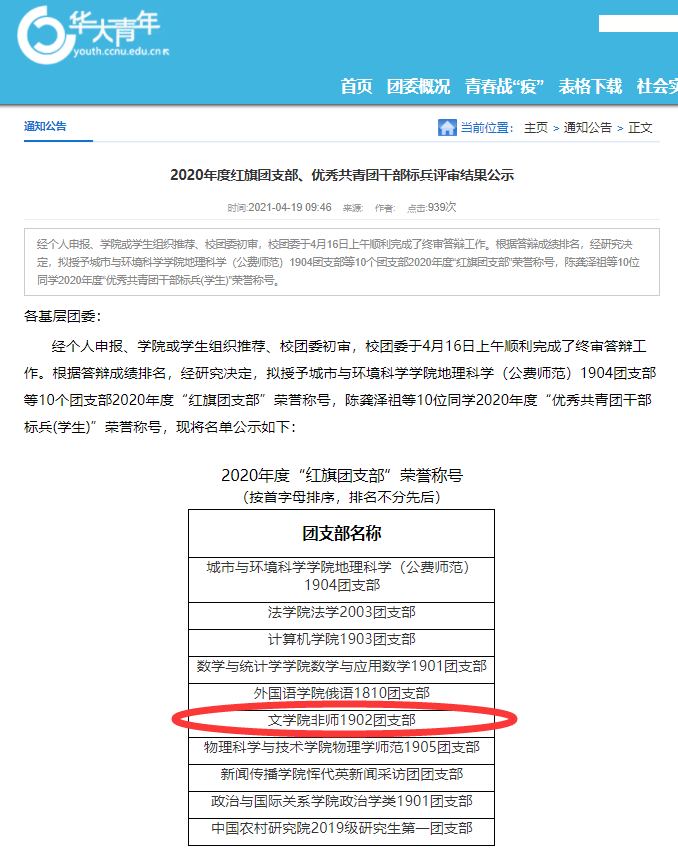 文学院非师1902团支部曾获2020年校优秀团支部、2020年校先进班集体、2020年校“活力团支部”三等奖、院先进抗疫团支部、院“话剧大赛”三等奖等多项荣誉。未来,非师1902团支部必将担负历史使命与责任,凝心聚力,砥砺前行,为实现中华民族伟大复兴的中国梦贡献青春力量!