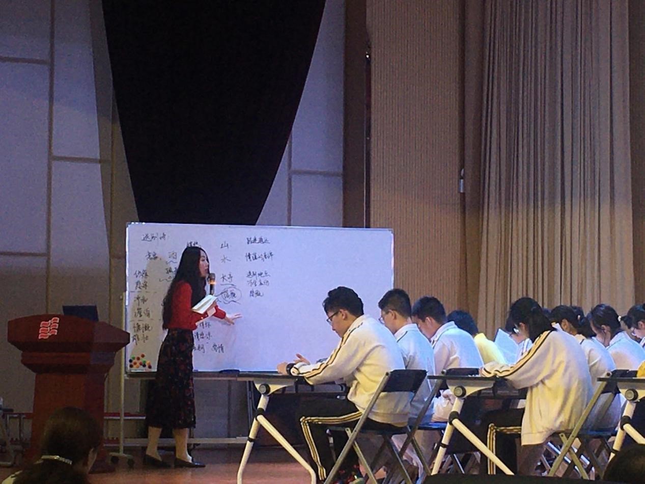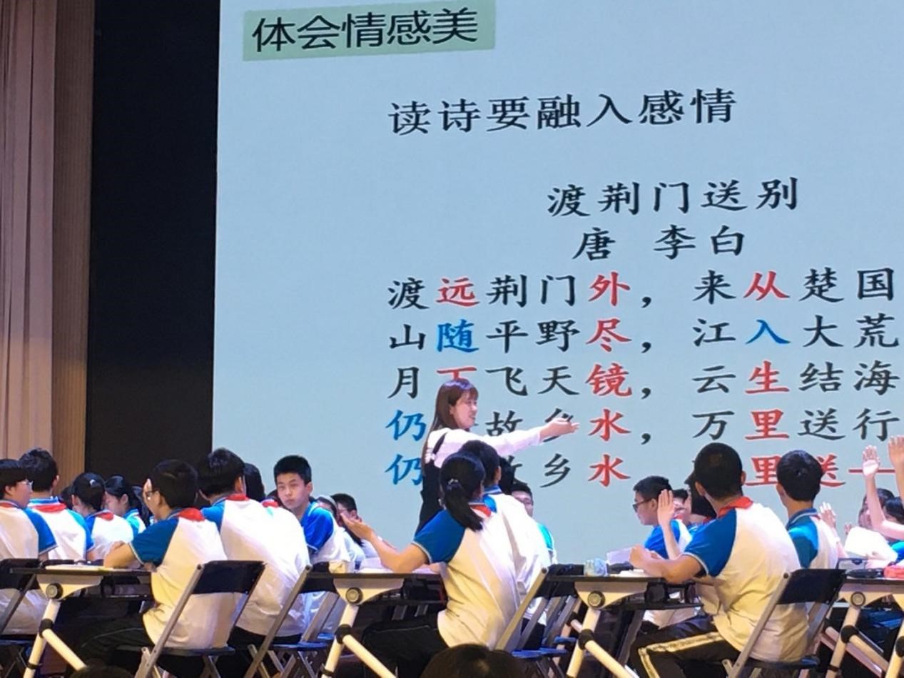 其次,由武汉市第三寄宿中学的朱琳老师进行“‘别’有一番滋味在心头——以《渡荆门送别》为例的李白送别诗教学”的公开授课。朱琳老师以古时再会难期和文学家离别的滋味引入送别诗,开始诗歌《渡荆门送别》的寻美之旅。首先她带领学生领略诗歌的音韵美,提醒学生读诗技巧,学生在诵读中乐其声、晓其意并能自主概括诗歌所写之事、所抒之情。然后以小组合作的方式引导学生品味诗歌语言美,小组讨论激烈,学生积极主动地赏析、炼字。接着以清代文臣沈德潜的诗评提问,朱琳老师在学生的各抒己见中举例其他经典诗句的送别之意,就李白的“并不伤感”引出作诗背景,并以各联的情感指导合作朗读。她在对诗歌进行小结以后用同期作品拓展延伸,加深学生对诗人情感的体会。最后朱琳老师引导学生领悟内涵美,以耳熟能详的千古名句引出“不以物喜,不以己悲”的古仁人之心,将诗歌的内涵接入人生的离别。朱老师展示出来的引经据典并能紧扣主题拓展分析的能力,是语文教师提升教学质量的必修课。