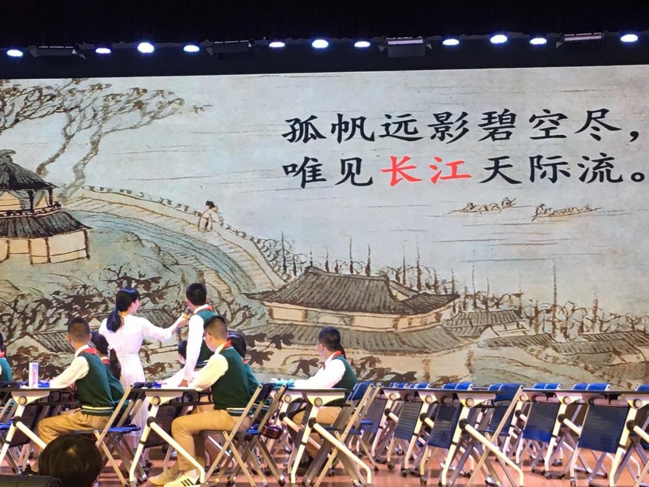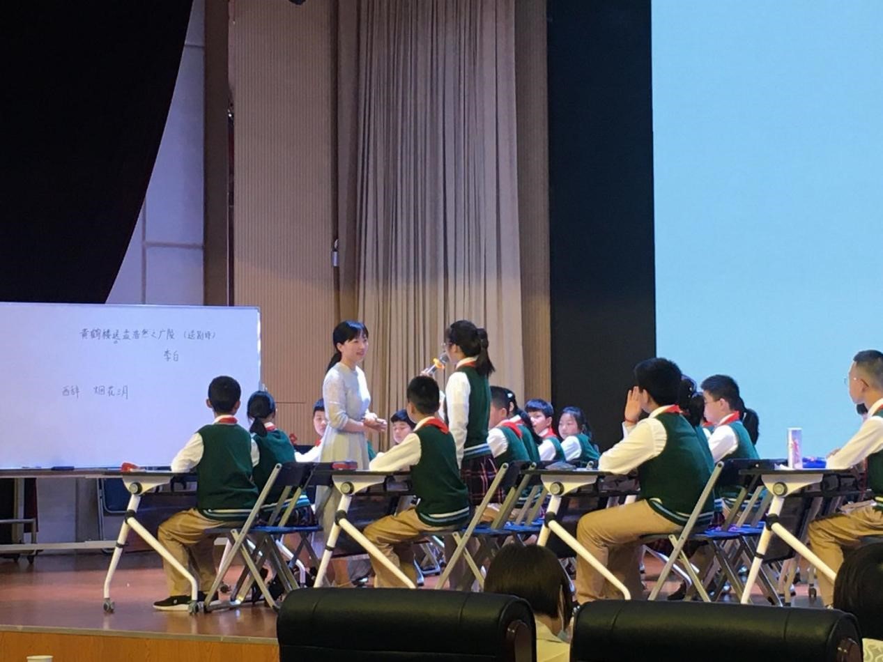 活动的第二部分由三节不同学段的“送别诗”展示课组成。首先,由汉阳楚才小学秦娟老师进行“送意送别·情深几许——送别诗《黄鹤楼送孟浩然之广陵》”的公开授课。秦娟老师首先揭示课题,提示书写诗题时注意字的结构,然后指导学生读题解题,接着秦老师以日记的创意形式串联古诗创作的时间、地点、人物,以简明易懂的白话文引导学生感知诗歌内容,然后选取“阳春三月”和“西辞”作为诗歌情感切口,用相关的成语、图片激发学生想象,用长江流域图形象地说明“西辞”的确切含义,最后回归整体,联系其他诗人的送别诗,用不同的ppt背景颜色暗示诗歌的感情基调,并以“李白用什么颜色的信纸写诗”来检验学生对诗歌的掌握情况,这堂课就在学生们充满奇特浪漫幻想的回答中结束了。秦老师在教学中运用各种紧扣主题的图片素材、富有新意的形式和引导联想的提问来激发学生们的兴趣,非常值得我们学习。