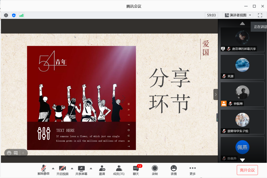 (通讯员 胡雨萱)5月16日晚,公师三班全体同学于线上展开以“传承五四精神,展现青春担当”为主题的读书分享会,作为本学期的第二次团日活动。本次活动由团支书钟振琳主持,全体同学参加。