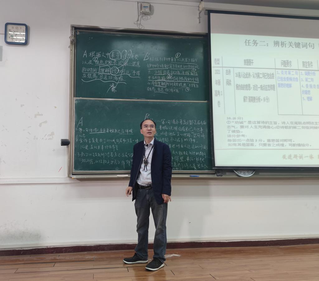 接着,吴东生以2021年语文新高考1卷的第5题和第9题为例,请同学筛选题干的关键词句,区分题目的的限定条件、背景条件与问题要求。随后,他展示了同学们对于古诗阅读题“题干问题要求”的不同理解,让大家讨论、判断每种理解的正误,说明了读懂题干、明确问题要求的重要性。他还请同学辨析题干关键词句,挖掘题干的隐含知识与答题指向,指出这是将所学知识运用于解题的关键步骤。