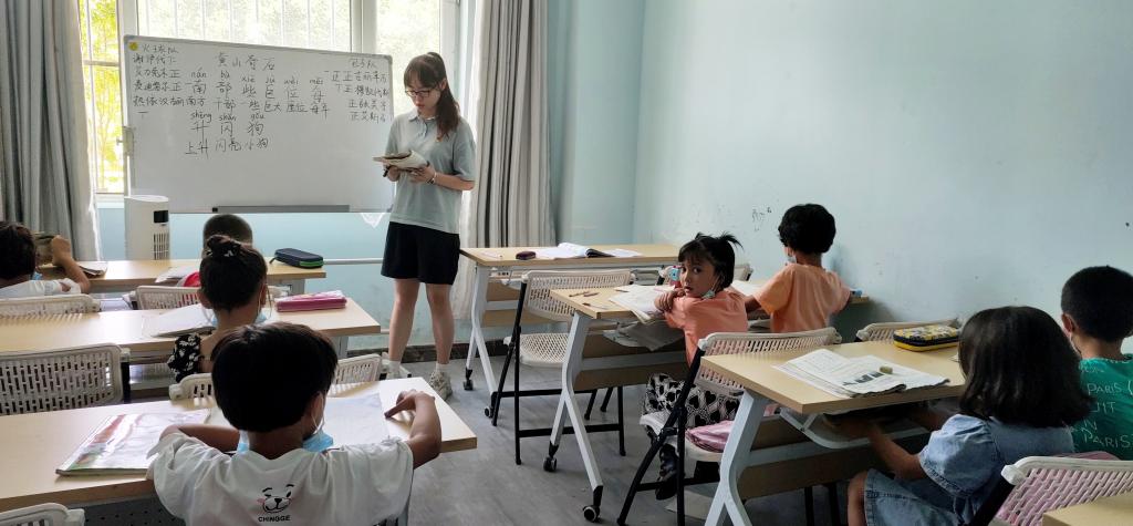 课程伊始,刘梦滢列出课文中的重难点生字,带领学生朗读、组词、造句,以增强他们对文本字词的记忆。随后,刘梦滢带领学生齐读课文,加深他们对整体内容的印象与理解。她还用“开火车”的游戏方式,让学生接力朗读课文,便于更好地了解学生对生字生词的掌握情况,并及时进行针对性指导。课程最后,孩子们的普通话发音、声调、语气及词句的连贯性都有了很大的进步。