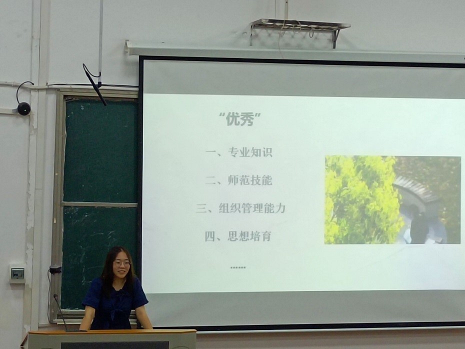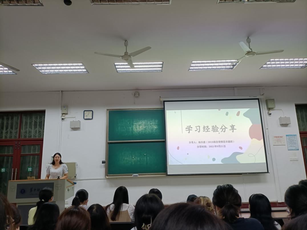 18级谷雨竹同学为公费师范的同学们分享学习经验。她从“公费师范生可以躺平吗?”“一个合格的公费师范生需要什么?”以及“一个优秀的公费师范生需要什么?”三个问题出发,提醒20级的同学们想要做一名优秀的教师,一定要有扎实的专业知识、过硬的师范技能和较强的组织管理能力等。分享结束后,众多同学举手提问,向学姐请教学习方法、教师资格证考试等各方面问题,谷雨竹予以耐心解答。