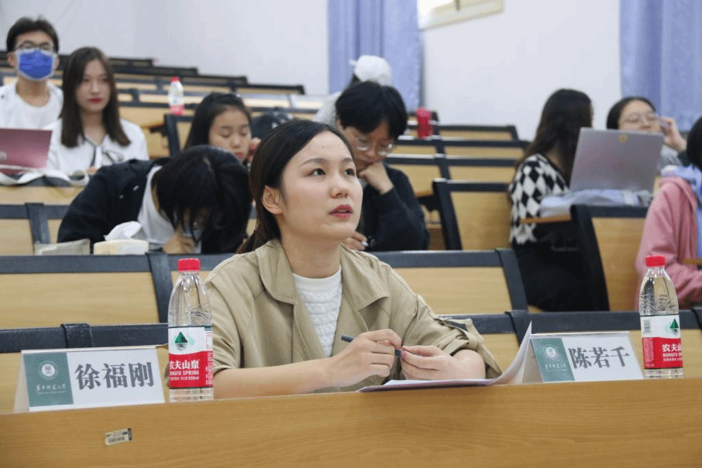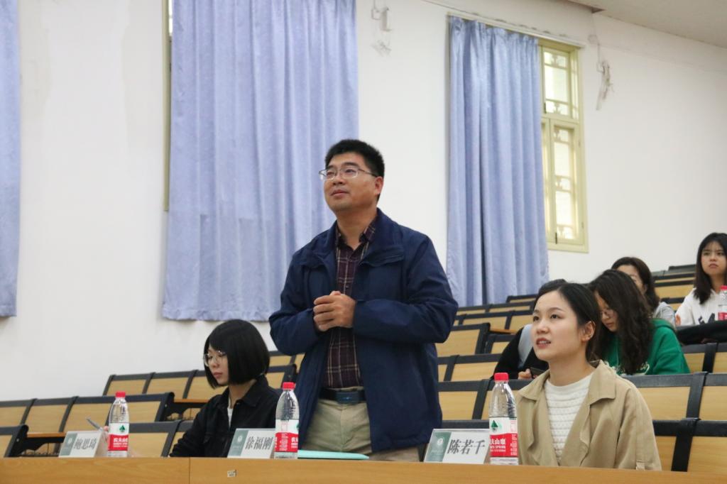 随后,19级师范生集体上台进行展示和答辩,他们运用幻灯片展示年级文化,以文小狮作为年级标志,分别从理想信念、道德情操、扎实学识、仁爱之心四个方面介绍年级的特色活动。徐福刚认为这次展示总体较好,但如果展示形式更加多样、更加吸睛,并进行脱稿展示会更加有力。紧接着,20级师范生集体进行展示,20级代表从树师德、炼师能、展师风、铸师魂四个方面介绍年级集体活动,展示了20年级的师范生风采。陈若千从内容和形式方面提出了建议,她讲道,“应当具有核心竞争力,更多地展示独特的师范生风采”。最后是20级公师二班进行展示,公师二班代表首先通过视频展示班级风采,以班级概况、班级建设两个部分分别介绍班级。鲍思琦认为展示思路应更贴近“师范生”这一活动主题,可以更多地展示师范类的特色活动,有利于呈现出师范生的特点。