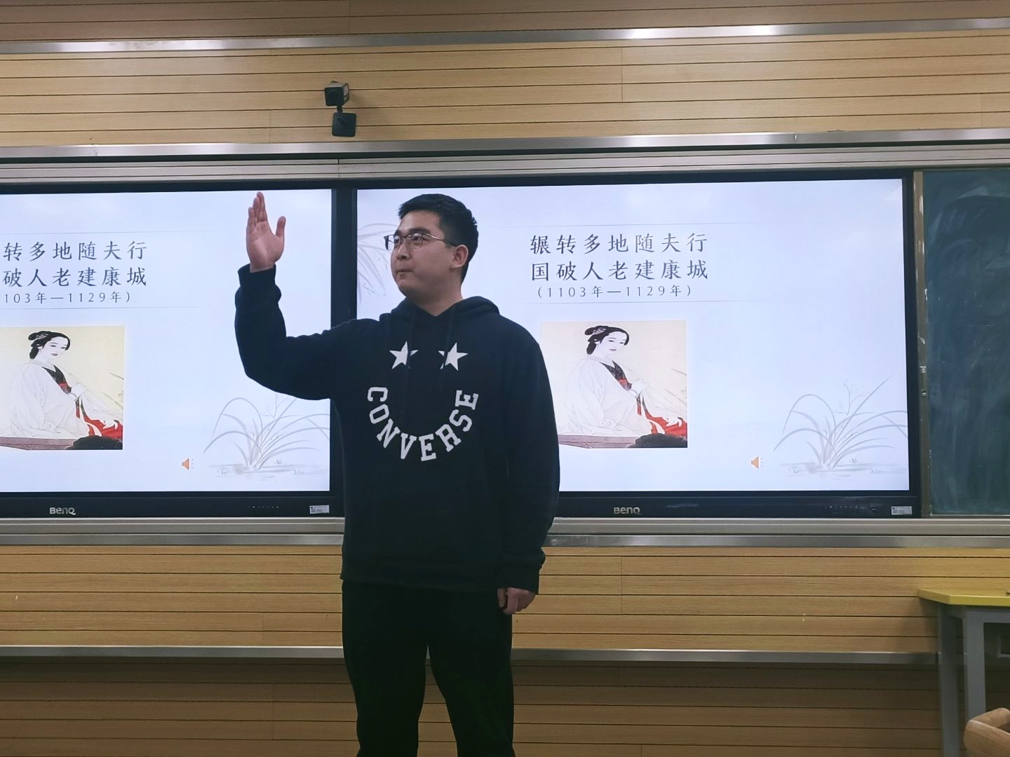 活动以暖场环节“诗词扎花”为始,主持人组织全班在牛皮纸上写下个人最喜欢的诗词,用纸包扎花束,作为活动奖励。暖场活动带动了现场气氛,调动了大家参与活动的积极性。在高涨的气氛下,分享活动正式开始。第一组采用讲、演结合的方式,演绎“一代诗鬼”李贺年少成名、英年早逝的一生。组员们用动作、台词演出李贺的人际关系与人生的起起落落,用诗朗诵表达充沛的感情。展示结束后,全班针对第一组的表现展开交流。张宇晗提问李贺“年少成名”与“婚姻”的经历,第一组随即补充说明。第五组分享的是他们心中“最可爱的诗人”苏轼,截取了苏轼人生中“兄弟情深”与“政绩斐然”两个截面进行讲解。展示过后,毕智慧与第五组对苏轼名字的由来交流看法,在探讨中加深对苏轼的认识。第三组创设了访谈与课堂教学的情境,融合朗诵、毛笔书画、模拟教学等形式,演绎一名师范生如何理解《沁园春·长沙》,将个人情感与毛泽东的情感交织到一起。交流环节,第三组补充说明了展示的构思与选点。