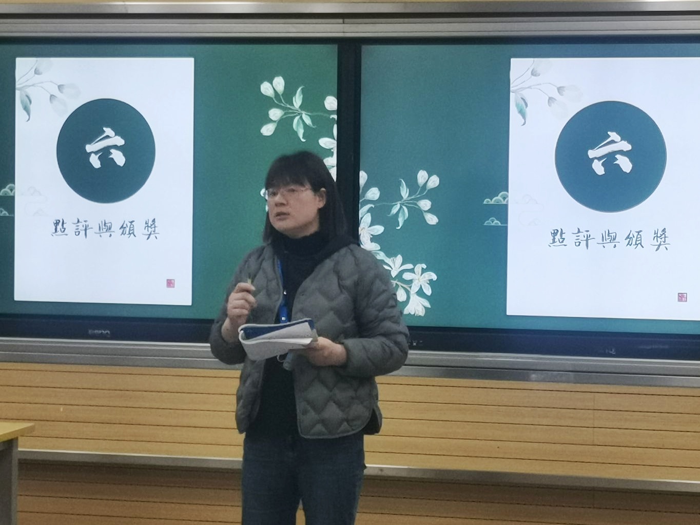 所有小组展示完毕后,活动进入“飞花令”环节。全班以小组为单位进行比拼,每组轮流说出带有“春”“花”“风”“月”的诗句,你来我往、难分高下,尽显诗词功底。激烈的比拼过后,班导师陈秀玲对活动组织和各组表现进行点评。首先,她对第五组的精心策划给予肯定,借此指导大家怎样策划一场好的活动,并对活动后续的总结提出要求。接着,她依次点评每组的表现,突出每组的独特之处,再对照活动初衷和目的进行总体性评价。