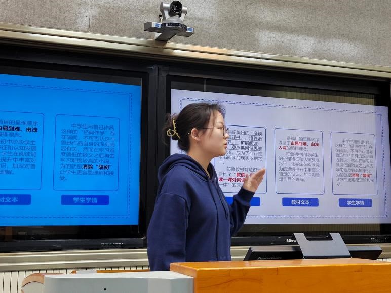 孙雪格从初中、高中教材对《呐喊》的篇目选用情况入手,为学生制定了详细的阅读计划:情节概括促读、疑问交流促读、思考题促读。同时,她强调了《〈呐喊〉自序》对初中生初步认识鲁迅及其作品的重要意义,提醒大家予以重视。许畅则结合《哈利·波特与死亡圣器》一书对自己阅读生涯的影响,选取部分内容进行文本解读,为同学们分享了《哈利·波特》中精彩的细节和由此引发的关于“反面人物”形象认知的深思。最后,毕智慧结合自己《百年孤独》一书的教学尝试,提出了本书导读的关键要素:提炼出单元核心主题——孤独,并以此串联典型人物。