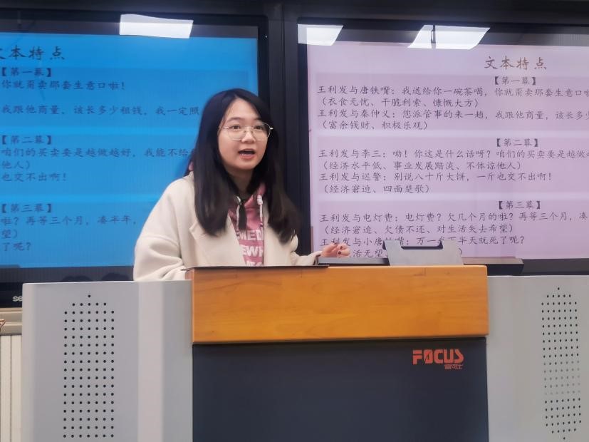 第二期活动更加聚焦整本书阅读教学,朱彦霖、卫薇、林婧雯、胡慧琳分别从《四世同堂》《复活》《茶馆》《百年孤独》四部作品出发,设计并展示了不同形式和层次的教学活动。教学设计既有情境模拟、对照分析、鉴赏评价等传统方式,也有话剧演绎、小小说创作、仿高考题等创新方式。他们的教学设计不仅关注了单篇文章的教学,也关注了文章在教材中的位置和联系,体现了整体观念和联系意识。朱彦霖为《四世同堂》设计编写书目的任务,让学生把握小说的整体内容,设计研读活动于细节处带领学生发掘小说意蕴;卫薇从阅读前学情调研、整本书内容概读、文本鉴赏与主题分析、共读一本书活动与小小说创作五个部分分享《复活》整本书教学规划;林婧雯将老舍《茶馆》的阅读教学活动放置在话剧演绎过程中,为学生设置了“我来导”、“我来试”、“我来演”三个不同层次的阅读情境,通过情境教学的方式为学生的整本书阅读设置框架。最后,胡慧琳分享了自己对《百年孤独》的执教经验以及教学活动设计,通过表格梳理魔幻情节,以仿高考题的形式设计主问题,对写作艺术进行探讨。