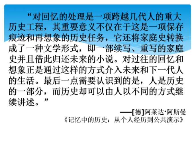 讲座最后,刘兮颖老师引用了阿莱达·阿斯曼《记忆中的历史:从个人经历到公共演示》一书中的观点为大家总结说明了记忆书写的重要性,并对美国犹太文学书写进行了最终的评价。