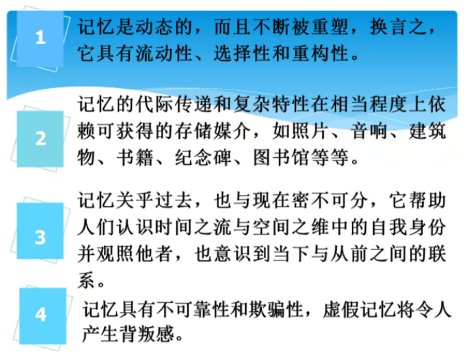 紧接着,刘兮颖老师借用《文化记忆研究指南》这本书中的记忆研究观点指明记忆之于文学的重要性,并指出了记忆的四大特性。
