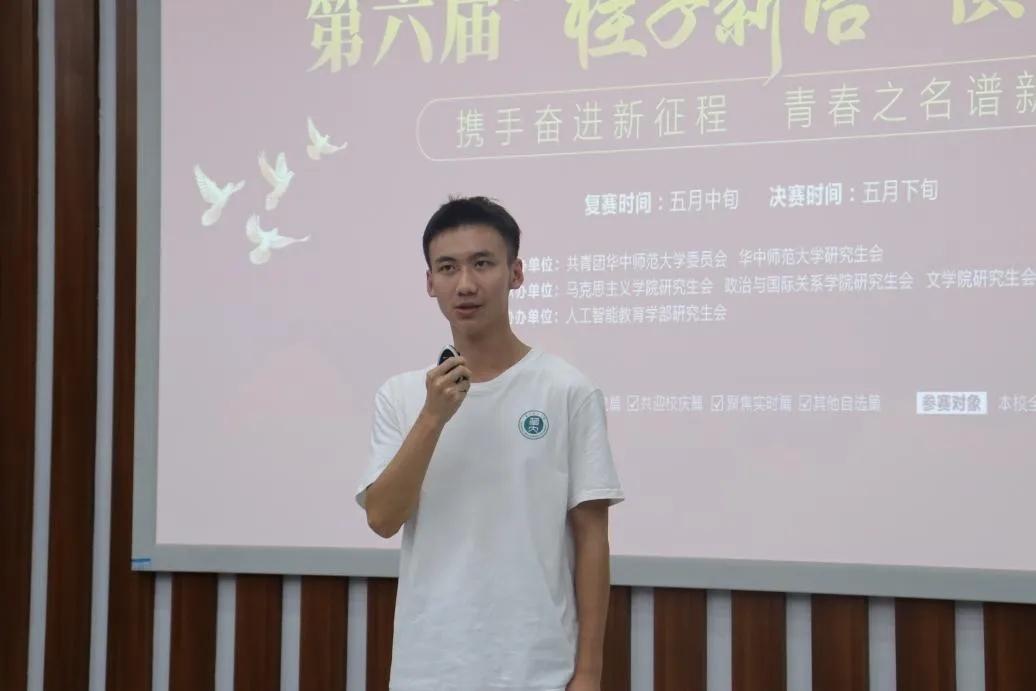 (通讯员校研究生会 马克思主义学院研究生会)5月13日,由共青团华中师范大学委员会、华中师范大学研究生会主办,政治与国际关系学院研究生会、马克思主义学院研究生会、文学院研究生会承办,人工智能教育学部研究生会协办的第六届“桂子新语”演讲比赛复赛成功举办!本次大赛也是学校第三十六届“树人杯”艺术文化节的重要活动之一。