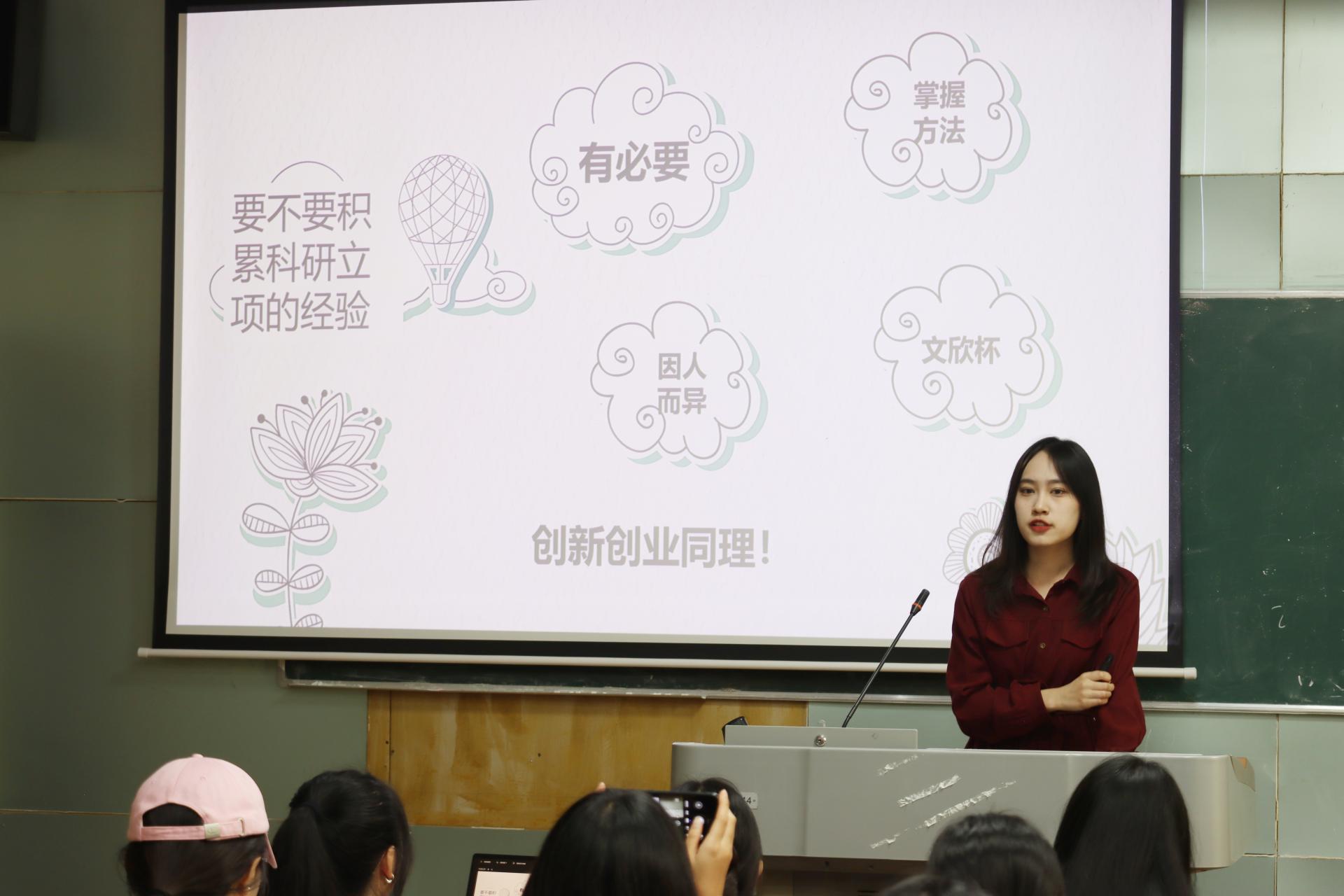 主讲人张玉佳则以七个“要不要”的问题为引,与新生分享自己的学习经验。她提出要做到自发性、自主性学习,争取自我展示的机会,积累科研立项的经历,积极参加学生工作,向上社交,在充实和丰富自己生活的同时收获更多的知识与技能。在结束环节,她寄语新生要勇于试错,寻找适合自己的学习节奏,同时保持规律健康的生活习惯。