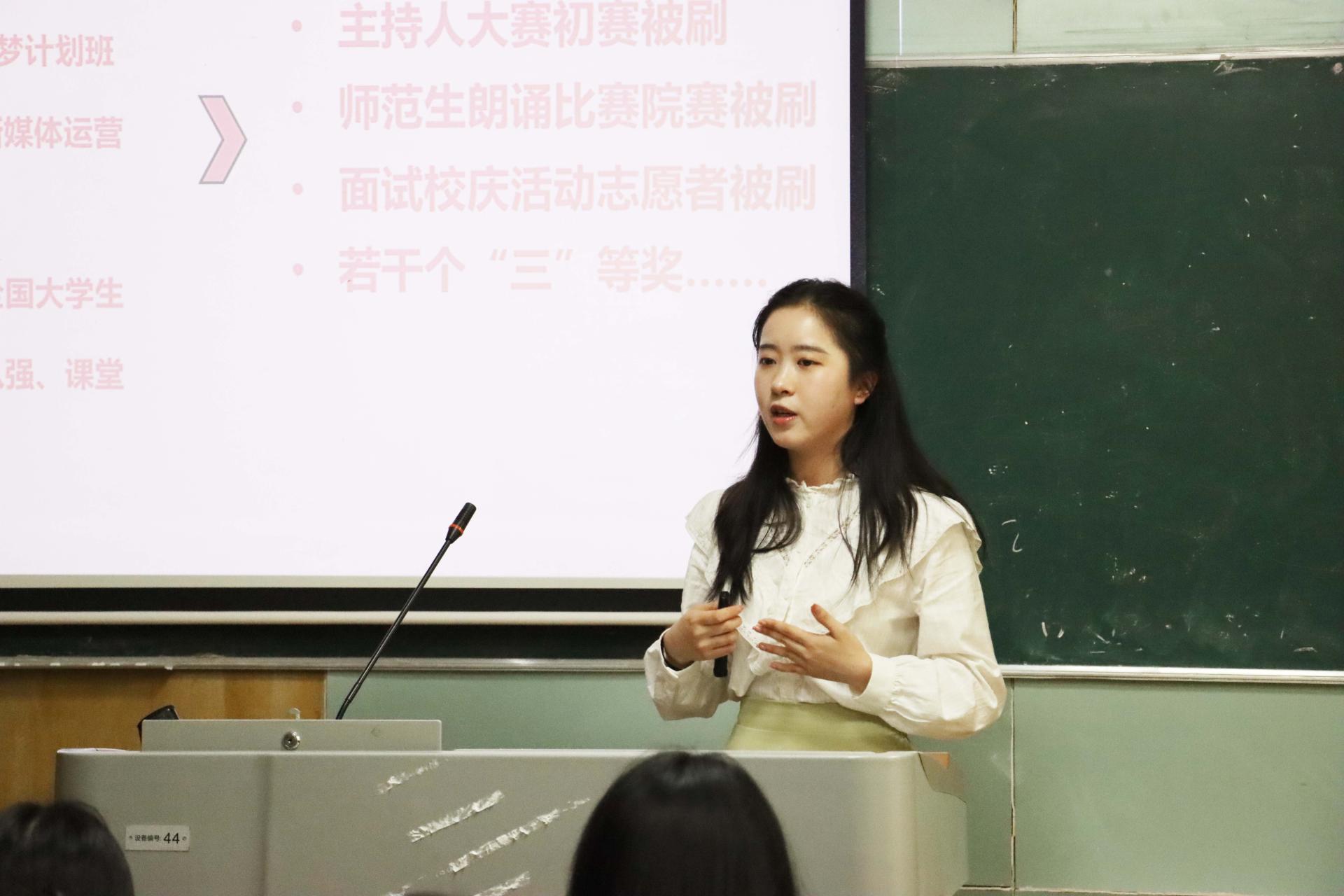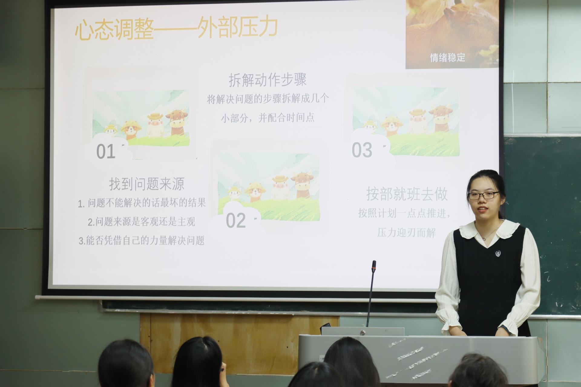 公师场主讲人来佳宁从日常学习工作和期末备考技巧两方面向新生分享了自己的经验。她指出要做好学习、时间、发展方向的规划。学习上要在薄弱的科目多花时间,对于感兴趣的科目应深入研究;与此同时平衡好学业与学生工作二者的关系,合理安排学习任务,做好清晰的时间规划;在发展方向上,她结合自己准备百生讲坛比赛的经历,鼓励新生在大一时积极报名参加专业比赛,积累比赛经验。