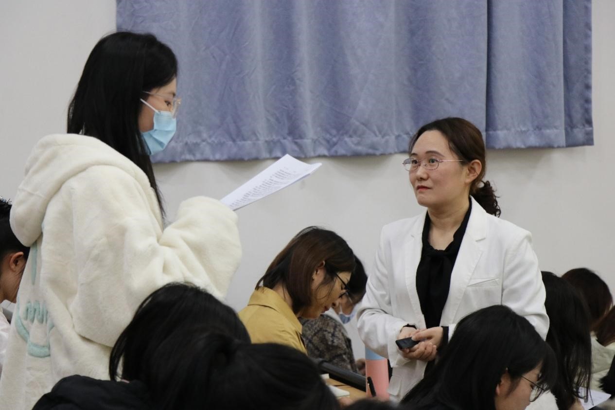 师生交流环节,被问到在教学活动中如何以学生为主体、体现以“学”为中心时,她解答道,要改变传统“满堂灌”教学模式,进行活动设计,给学生任务驱动,让学生更好地参与课堂、融入课堂。