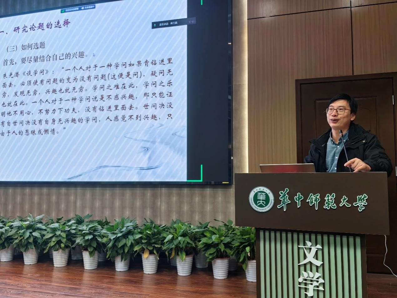 随后,付林鹏从材料搜集与研读角度展开讲述,多次强调读书的重要性,谈到读书的几重境界——从知识到见识到才识再到胆识,并提出了“明体系,立根基,知途径,通文字,熟材料,知得失,能体验,成才具”的读书方法,旨在让同学们提高阅读效率,实现有效阅读,以此奠定学术论文写作的基石。