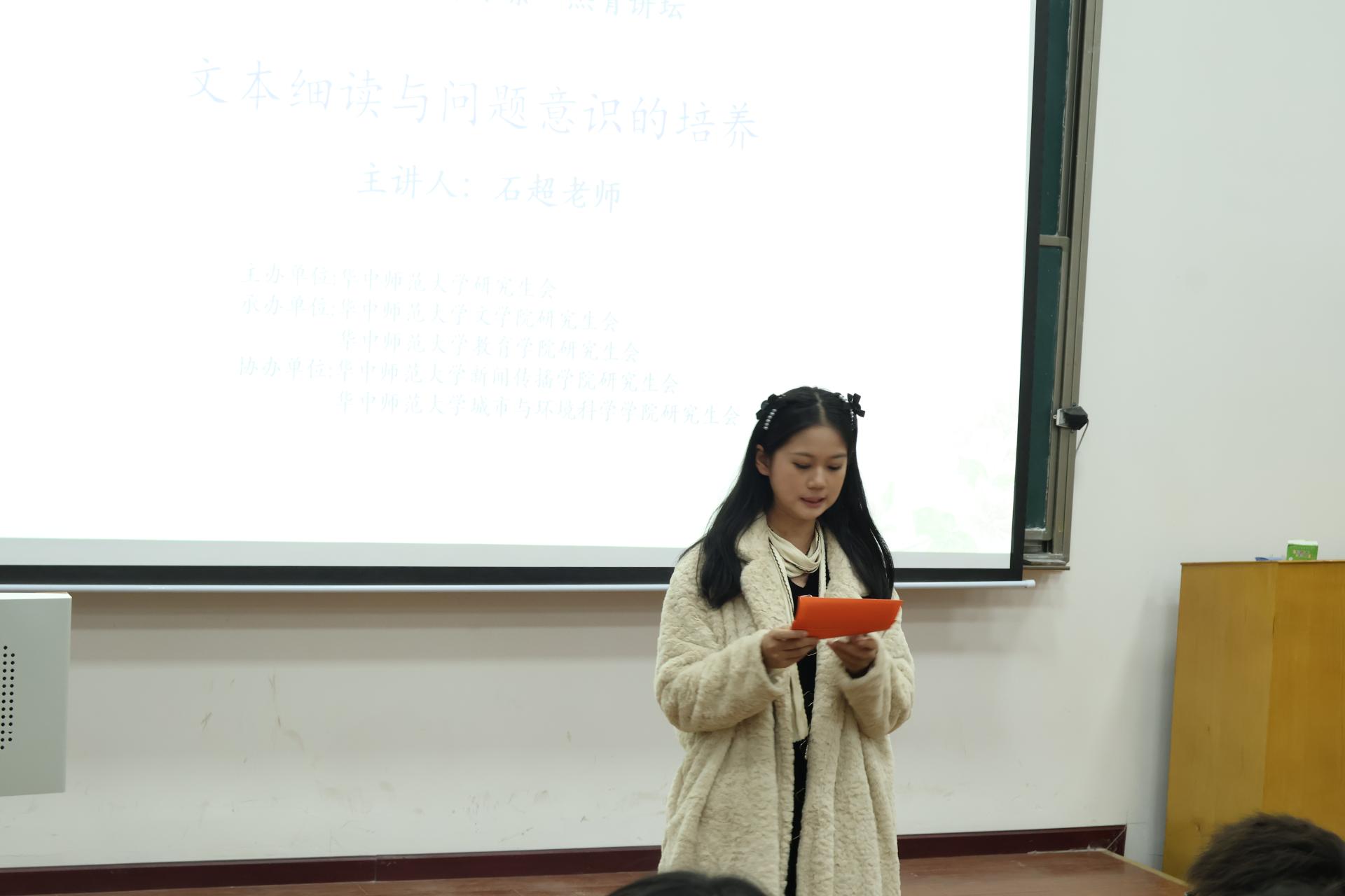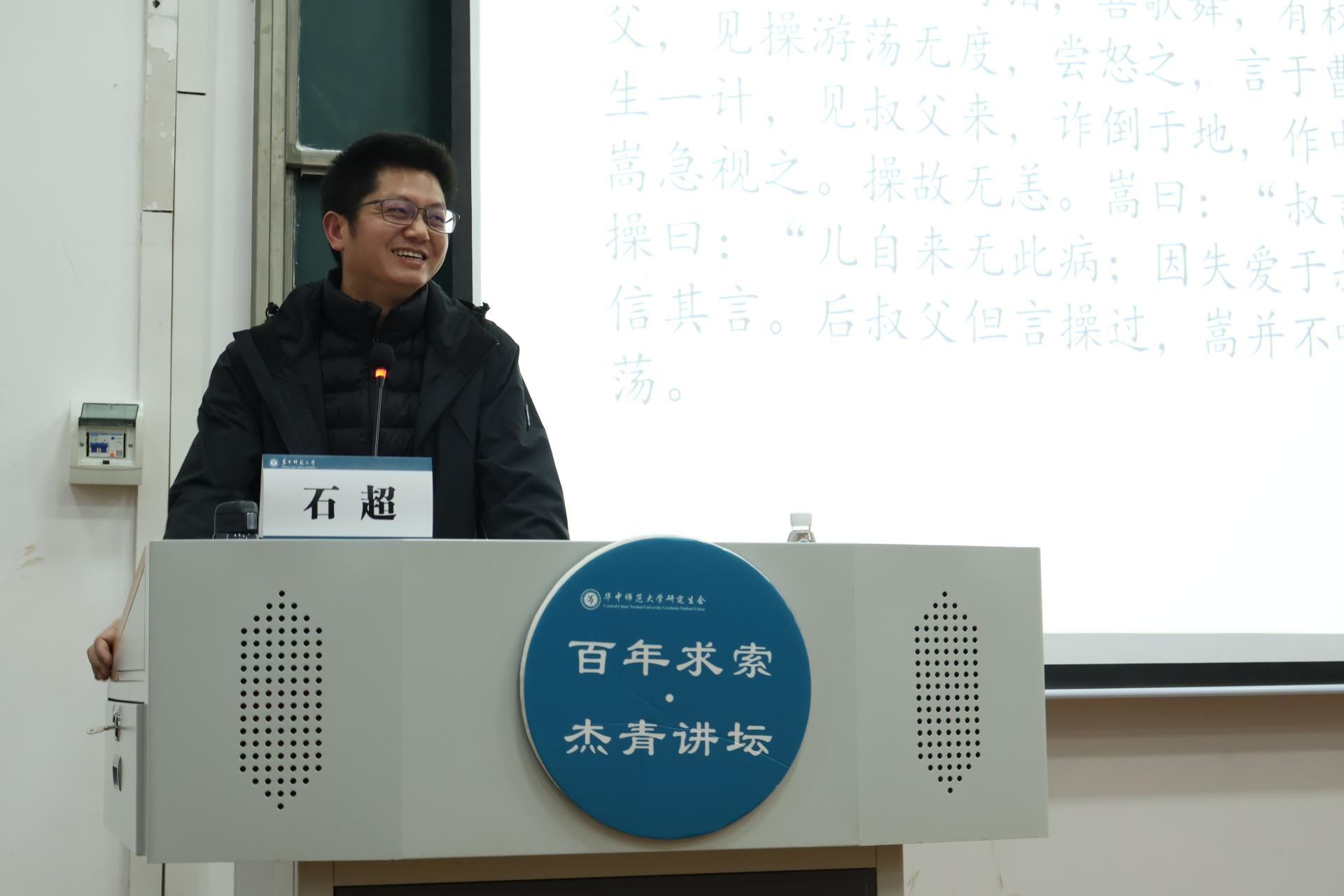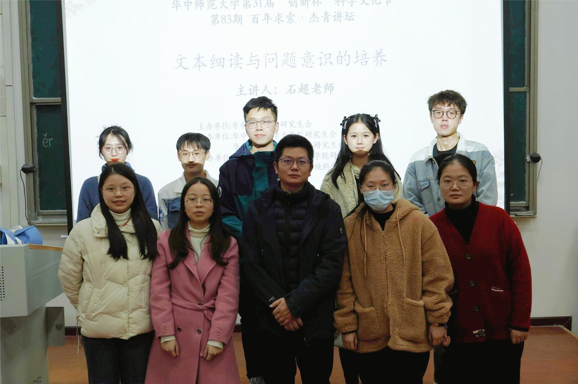 (通讯员:叶政通)11月25日下午,第83期百年求索·杰青讲坛“文本细读与问题意识的培养”讲座成功举行。本次讲座由共青团华中师范大学委员会、华中师范大学研究生会主办,文学院研究生会、教育学院研究生会承办,新闻传播学院研究生会、城市与环境科学学院研究生会协办。本次讲座特别邀请华中师范大学文学院副教授、硕士生导师石超老师作为主讲嘉宾,由新闻传播学院刘子琪同学主持。