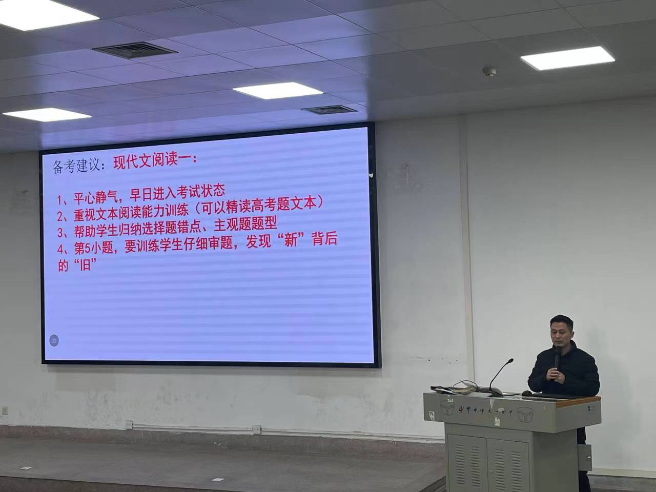 在教研报告环节,作为T8联考语文试卷的命题组老师,华师一附中学工处沈胜方老师结合高考真题介绍了真题思路,归纳分析了题目特点,提出备考建议,进行了有独到见解的方向指导。如从整体上,要注重训练学生仔细审题,发现“新”和“旧”的问题;要重视对学生审题能力和思维能力训练;要注重现代小说上对文学创作实践方面的探究,提高阅读能力。要文言文增加陌生实词的学习训练,强化古文推断能力考察。要重视对补写句子、修改病句的训练。要重视作文与教材的教考衔接,分析材料要仔细斟酌,读出材料之间内在关联,宜写透写清、言之成理,避免无机罗列、机械分论的形式,在精准界定后理性剖析、形象表达。