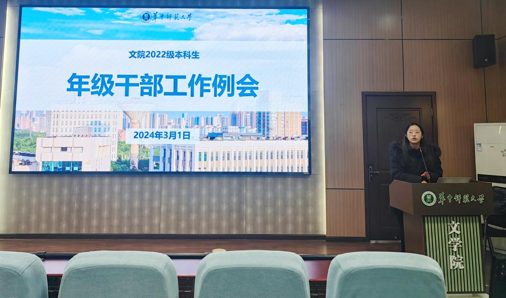 (通讯员:刘若涵 吴优)3月1日,文学院2022级(以下简称“22级”)新学期学生干部工作例会于学院一楼报告厅召开。会议由22级辅导员付雨点主持,文学院党委副书记桂文亮,22级本科生辅导员崔宏博,22 级本科全体年级、班级团干成员到场参与。