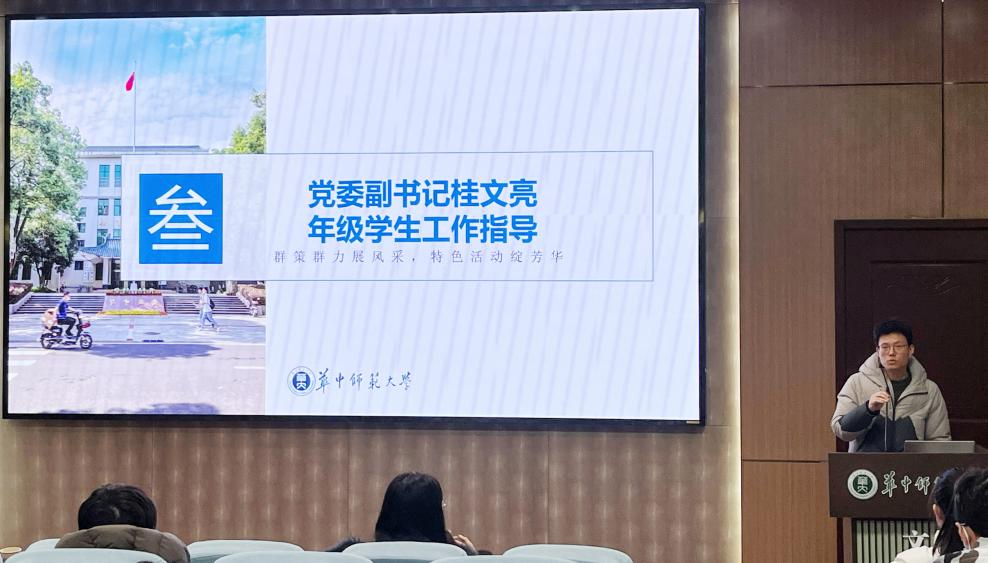 党委副书记桂文亮进行学生工作指导。他首先肯定了22级学生工作取得的成绩,表示年级学生工作是学院工作的重要基础与支撑,激励年级学生干部应当坚定理想信念,共同建设团结奋进的学习氛围。在具体工作方式上,他从三个方面为学生干部提出了工作建议,强调学生干部应该做好思想引领工作、做好学生和学院的桥梁纽带,并发挥好干部群体的榜样示范作用。