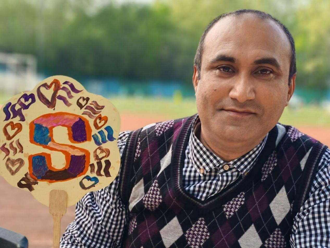 来自巴基斯坦的Simon一家对我们的活动产生了浓厚的兴趣,他们克服了语言的障碍,参加了锤丸、投壶、扇面作画、发饰DIY活动。Simon在扇子上画出“S”表示这是他的名字,他的妻子Nida则是画了一朵花,以此来表达自己对Simon和孩子的爱。