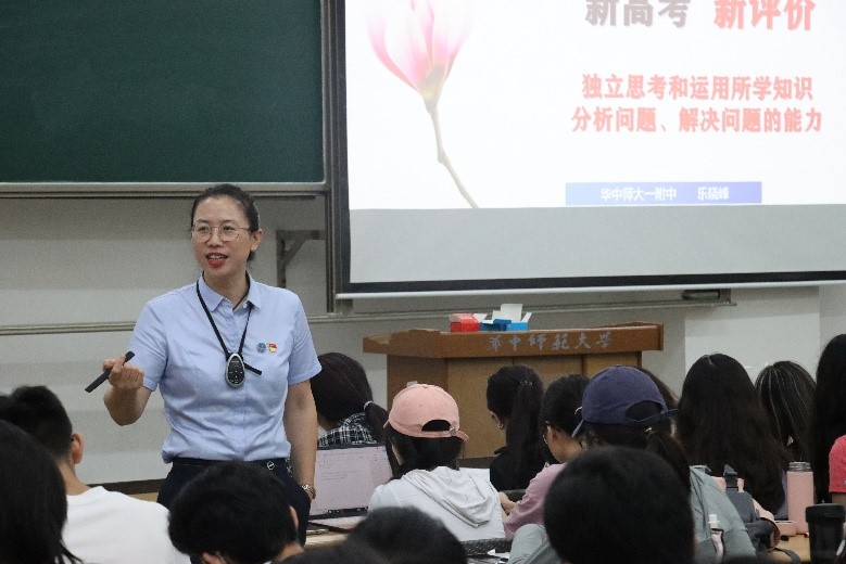 乐老师从自身经历引入,向现场同学提出问题:“新课程、新教材、新高考、新评价,究竟新在何处?”针对这一问题,乐老师提出,“新”首先体现在对理想信念的高度重视上,启示同学们要坚定“立德树人”的根本方向。其次,“新”还体现在了教学逻辑上,教育的逻辑起点应在于塑造自由、独立、健全的精神人格,教师要尤其注重培养学生独立思考和运用所学知识分析、解决问题的能力,同时要带领学生感受真实的语言文字的魅力、提高学生的思维力。
