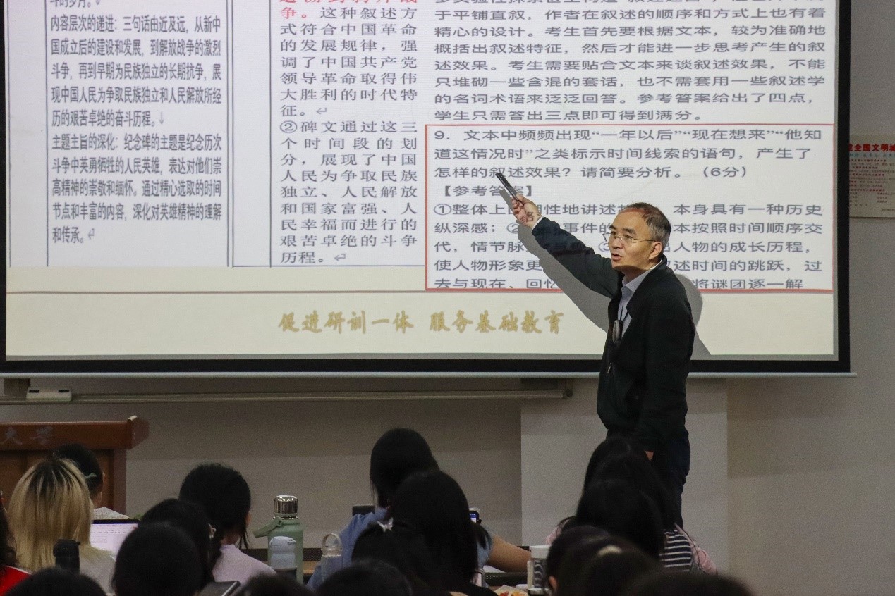 接着,吴老师向同学们讲解了在新课改背景下,为什么要进行“情境化”教学研究以及目前研究情况和取得的优异成果、未来推进研究的方向和规划。之后,吴老师通过课前作业的分析向同学们解释了语文的本真两个分级。并利用课前对于人民英雄纪念碑碑文的例子,向同学们详细分析了阅读的方式和规律等。