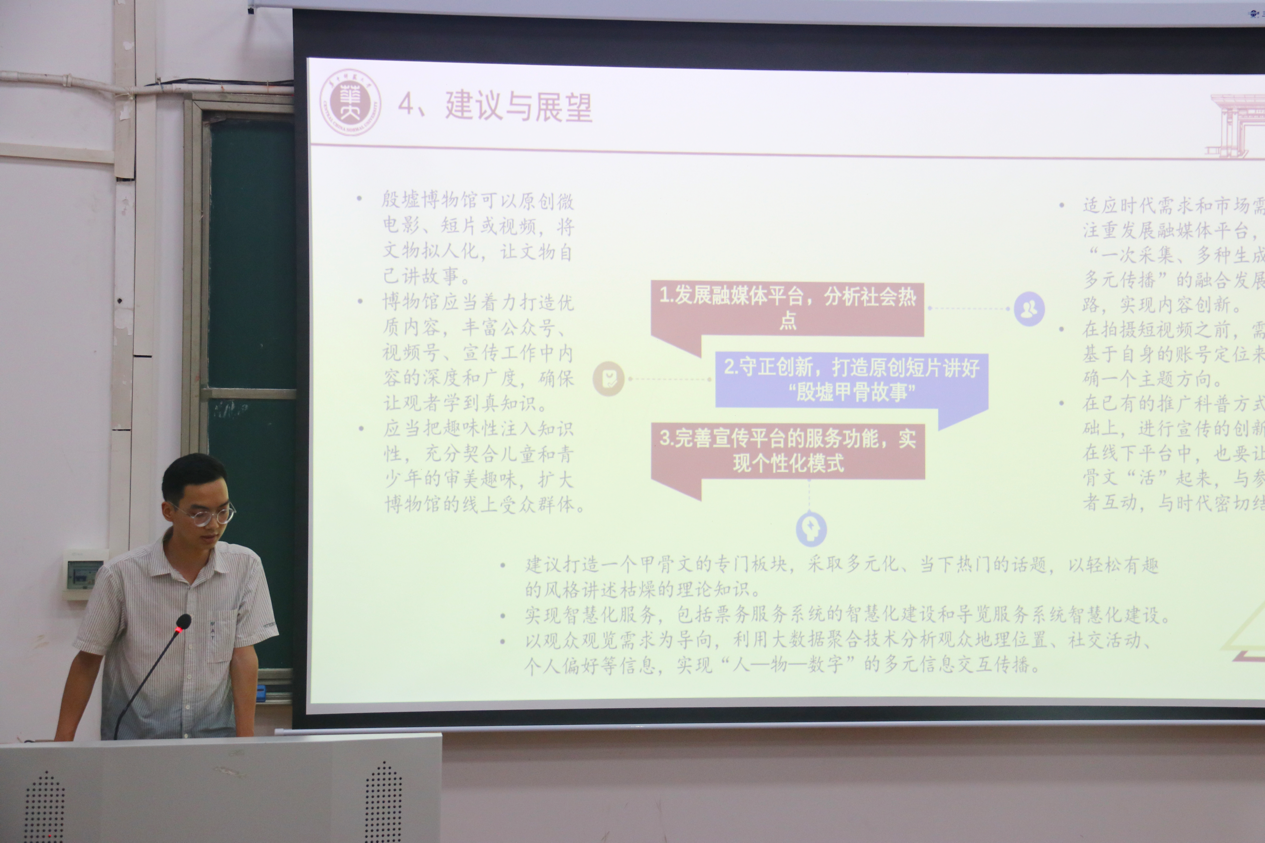 卓然、张震和林诗洋三位同学依次分享社会实践经验。卓然以社会实践实习为主题,强调要明确实习目标、注重找岗过程、清晰实习类型;张震围绕甲骨文调研和“推普”调研,分享了他在参与过程中的调研思路和相关学习成果,并进行了调研经验的总结;林诗洋指出,“只有热爱,方能长远”,要注重社会实践过程,把握选题,凝聚团队,尊重民俗。