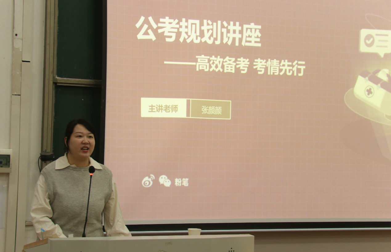 在第一场讲座中,张颜颜首先介绍了公文写作的基本概念和重要性,随后详细讲解了公文的结构、格式、语言风格以及写作技巧。她通过生动的案例分析,对我国当前的公职认知、考情现状进行了深入分析,使学生们对公文写作有了更深刻的理解和认识。除了有关理论知识的讲解,她还对选岗指导以及备考规划进行了透彻分析,并强调资料分析重在分析而非计算的特点,解答了同学们有关公考规划方面的疑问及困惑。