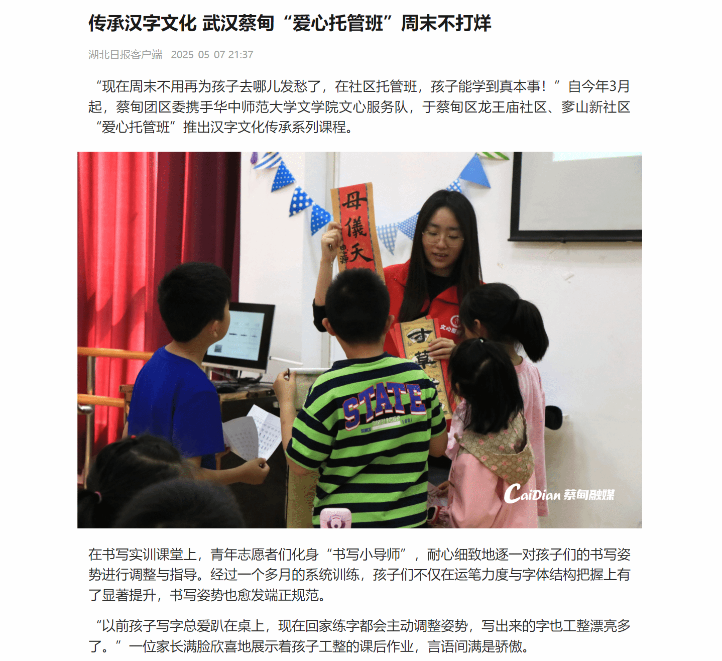 “现在周末不用再为孩子去哪儿发愁了,在社区托管班,孩子能学到真本事!”自今年3月起,蔡甸团区委携手我院文心服务队,于蔡甸区龙王庙社区、奓山新社区“爱心托管班”推出汉字文化传承系列课程。