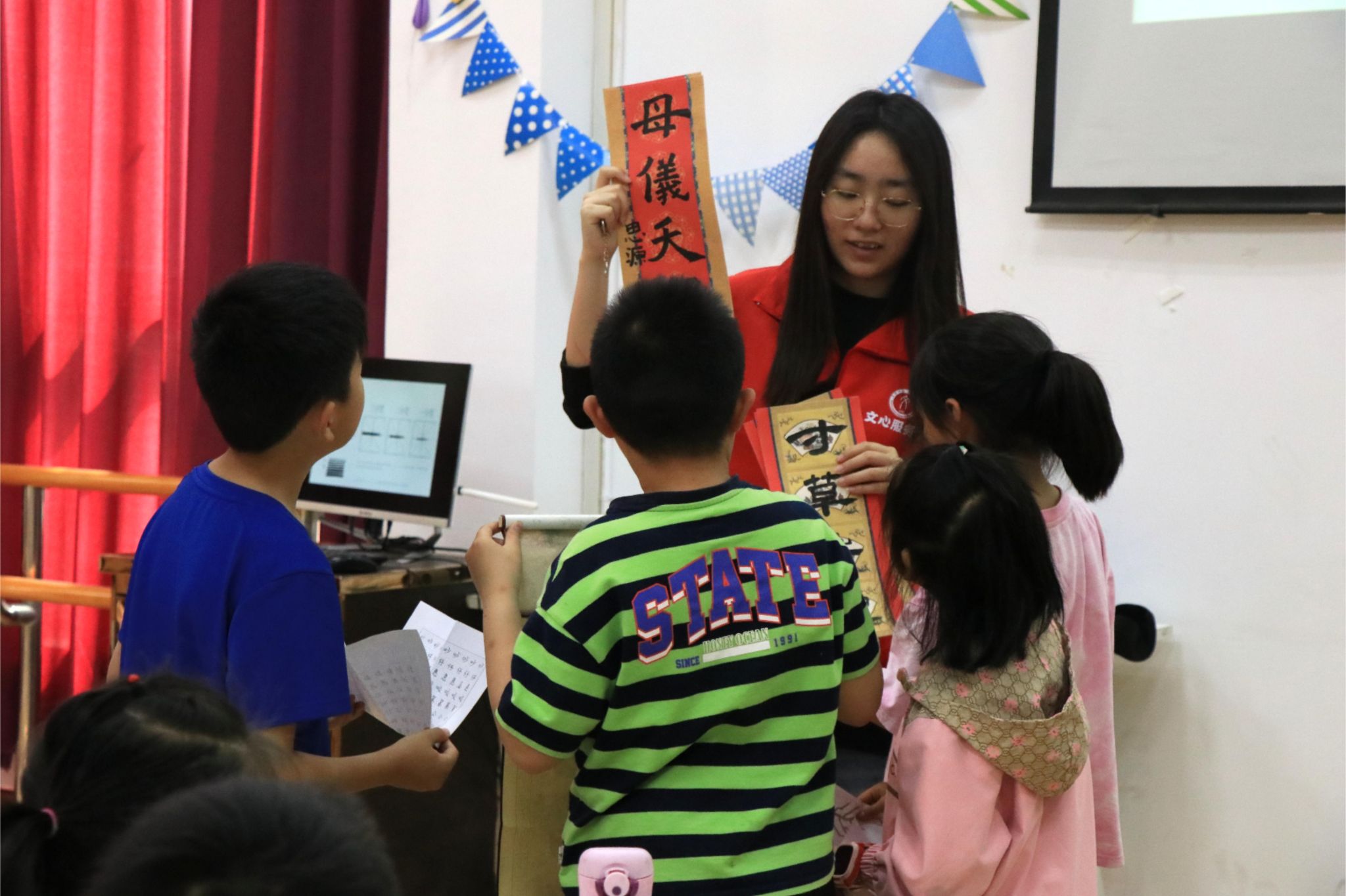 据悉,依托我校中国语言文学一流学科优势,我院青年志愿者精心打造“汉字 +”课程体系。每周六,孩子们都能在“爱心托管班”免费参与书写姿势养成、汉字文化拓展、书写实践鉴赏等公益课程。